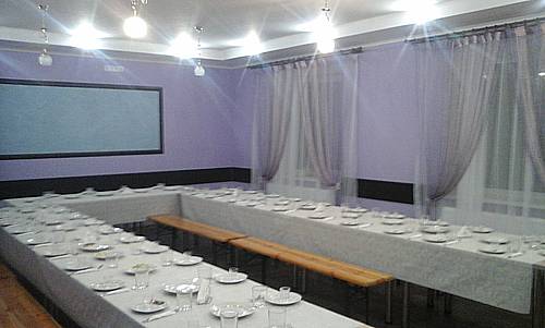 Усадьба – это отдельно стоящее двухэтажное большое здание. На первом этаже расположены кухня, санузел, места для отдыха, зал для банкетов. На последнем остановимся отдельно: он большой по вместительности, а значит, в нашей усадьбе можно провести семейное торжество, корпоратив – и всем хватит места.